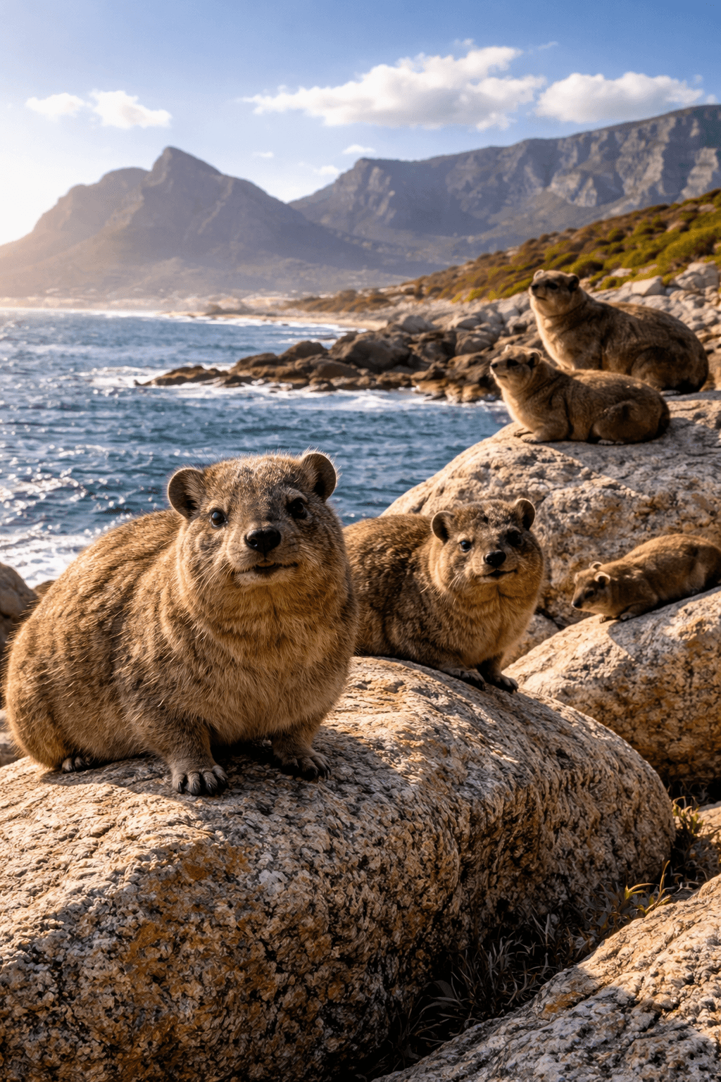 Bakoven se dassies sit in klossies en waag vir die son se vroeë strale