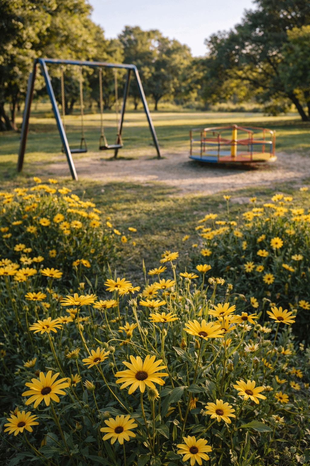 hier waar klein voetjies en stootwa wiele die blommietjies trap